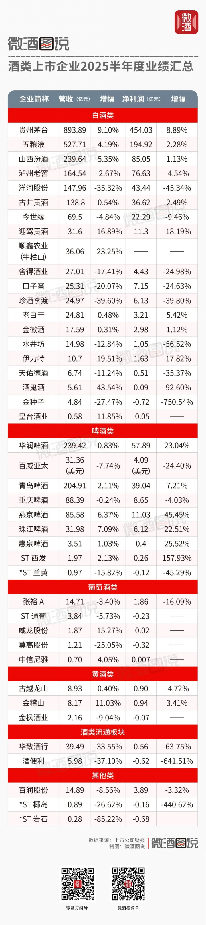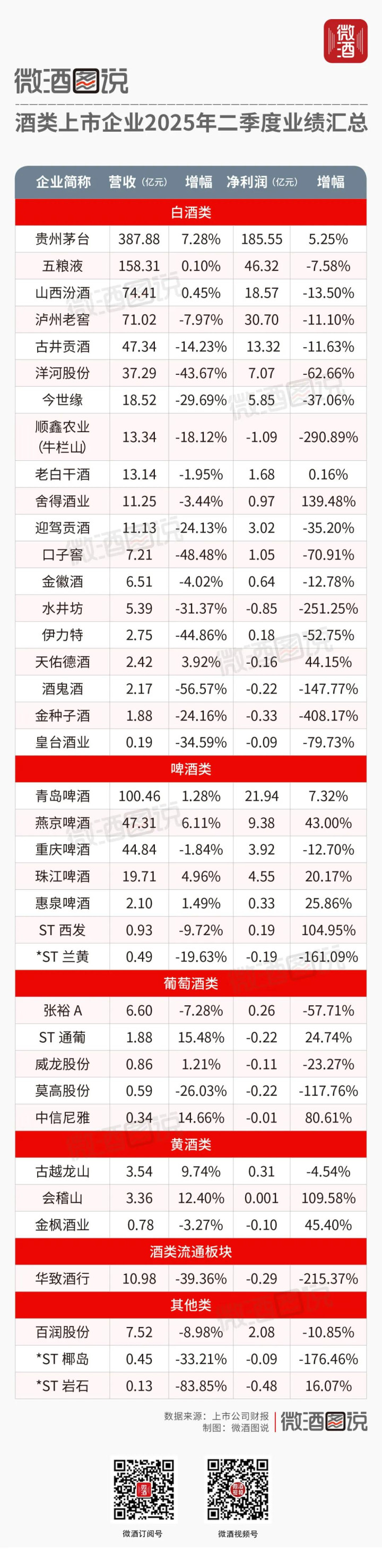 从数据来看,以茅台、五粮液、汾酒为代表的头部企业在调整“深水区”依旧保持“稳中有进”的态势,上半年营、利保持增长,展现出较强的发展韧性与抗风险能力;而中小企业则面临更明显的业绩回调,且利润的跌幅相比营收要更为显著,行业分化格局进一步凸显。