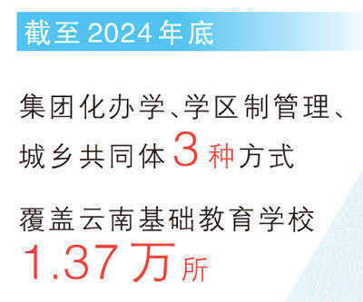 r近年来,云南省基础教育优质资源辐射引领力持续增强,截至2024年底,集团化办学、学区制管理、城乡共同体3种方式覆盖云南省基础教育学校1.37万所、学生572.79万人,学校、学生覆盖率分别达54.51%、68.63%。