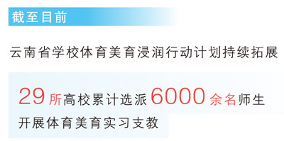 r通过体育美育浸润行动计划,云南已从全省高校选派6000余名师生,定向帮扶薄弱地区中小学,积极参与受帮扶学校的体育、音乐、美术等学科教学,让乡村孩子也能享受到优质的体育美育教育,全面提升综合素质。